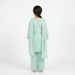 Girls Mint Green Embroidered Kurta Set with Dupatta – 3-Piece Festive Wear