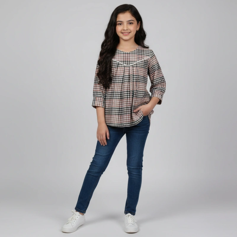 Elevate her casual style with this charming Multi-Color Check Tunic. This soft, ready-to-wear top features a delightful small plaid check pattern in a sophisticated autumnal palette, including shades of maroon, dark green, black, and beige/cream. It’s the perfect blend of comfort and classic style for the cooler seasons in Pakistan.
