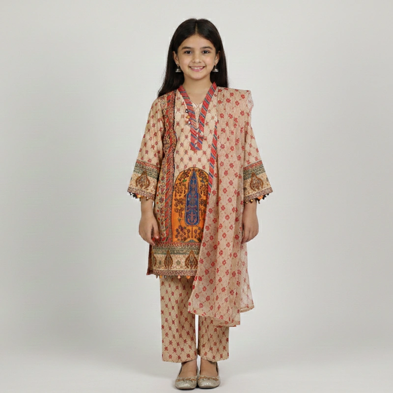 Elevate her ethnic wardrobe with this beautifully detailed 3-piece lawn suit. Designed with a focus on heritage-inspired aesthetics, this outfit offers a blend of comfort and timeless style.