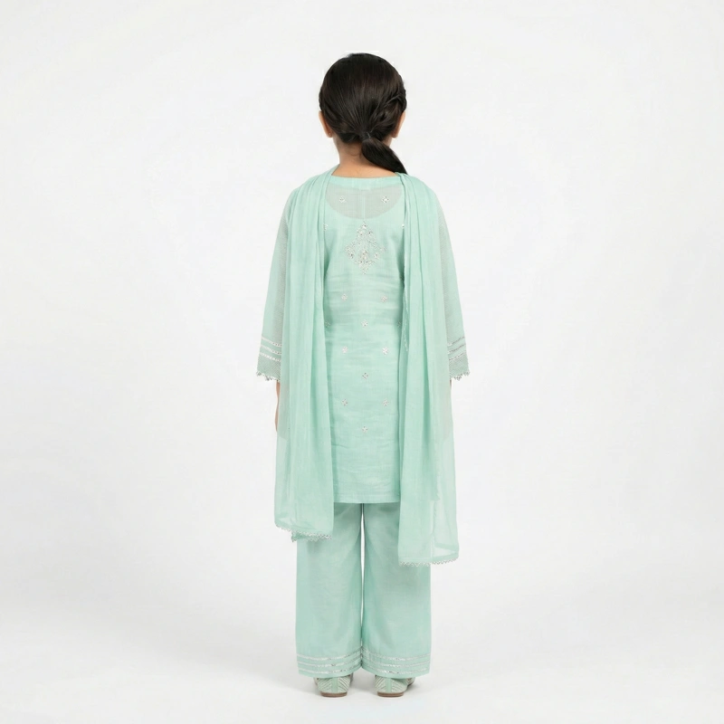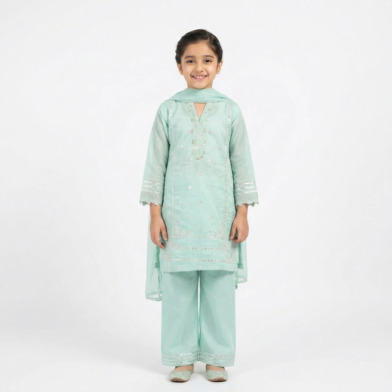 Elevate her festive wardrobe with our Girls’ Mint Green Embroidered Salwar Kameez. This ensemble strikes the perfect balance between traditional charm and modern comfort.